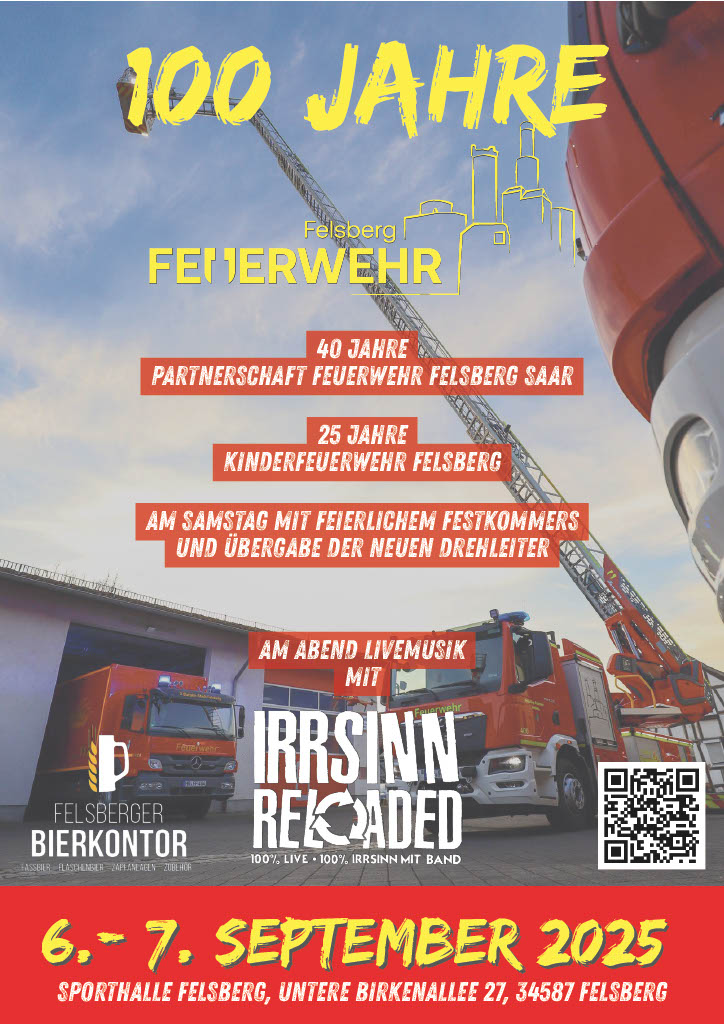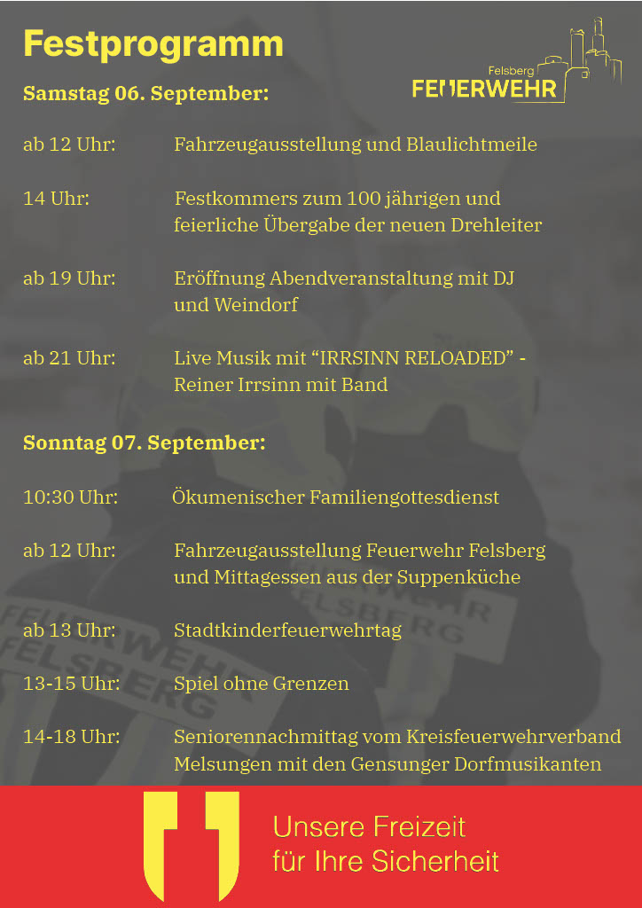 Feiern Sie mit uns! Wie bieten ein reichhaltiges Festprogramm für Jung und Alt. Lassen Sie uns gemeinsam zwei spannende Tage erleben und das 100 jährige Bestehen der Feuewehr gebührend feiern. Eurer Feuerwehr Felsberg